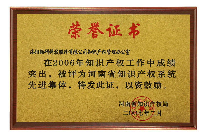 在2006年知識(shí)產(chǎn)權(quán)工作中成績(jī)突出,被評(píng)為河南省知識(shí)產(chǎn)權(quán)系統(tǒng)先進(jìn)集體